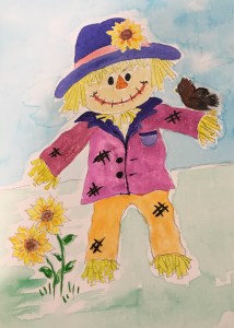 To prepare for their class, I had sketched scarecrows onto canvas panels for the residents to paint. I also came across some watercolor markers for them to try. And even though I only had a few primary colors, they were a big hit, and everyone used them to “paint” their autumn picture. I actually painted with them this time, and I used a set of watercolors. And by the time class was over, I had paint brushes and watercolors in their hands as well to do some of the background.